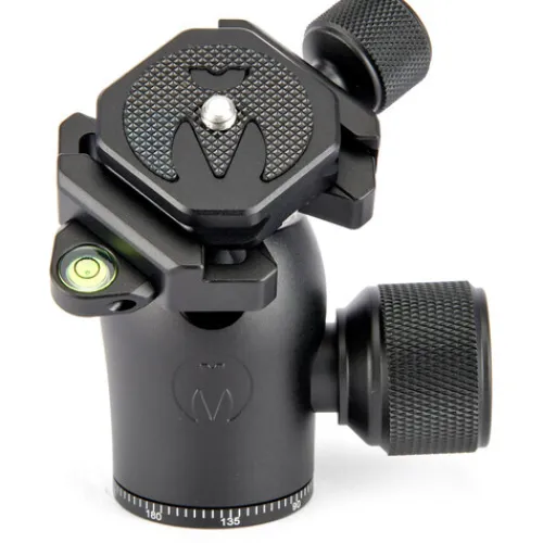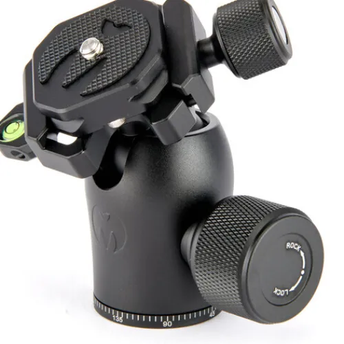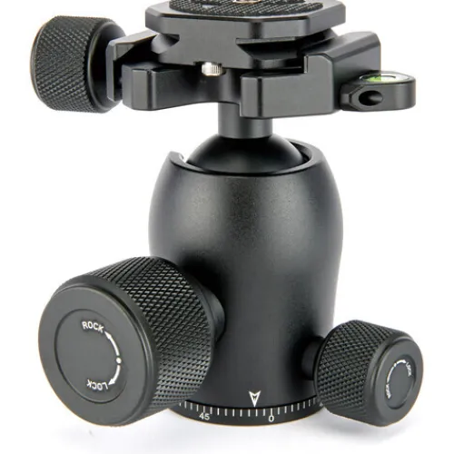 By loosening the ball head’s primary locking knob, the head’s ball-and-socket joint can be quickly swiveled, angled, fully tilted, or returned to its upright position. Under the primary locking knob is a secondary locking knob, which controls the ability to rotate the head 360°.
