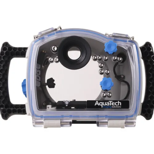 The EDGE Sports housing is compatible with AquaTech’s P-Series lens ports, and a port is required for use of the housing. A glass eyepiece provides a clear view of the camera’s electronic viewfinder. The housing has a standard left-side grip and a right-side palm stopper, which helps steady the unit when shooting video. The palm stopper can be replaced with an optional standard right-side handle. The quick-release back plate is self-guided, so you’ll know your controls are lined up properly. This housing is also compatible with the AquaTech M3 Pistol Grip.