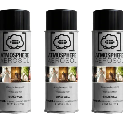 The Aerosol is a non-toxic spray that adds fog to your scene that lingers in the air for several minutes so you can create dramatic back-lit scenes for both video and still images. It is a clear spray that is safe to use around wedding dresses, suits and carpets without any risk of staining.