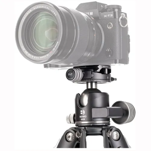 The GX35 ball head is a low-profile head featuring dual panoramic mode, which allows the panning head from its base and also from the quick-release platform. The controls are simple, with ball friction adjustment built into the main lock knob, plus an independent pan lock. It includes a PU56 quick release plate and features a quick-release plate safety lock.