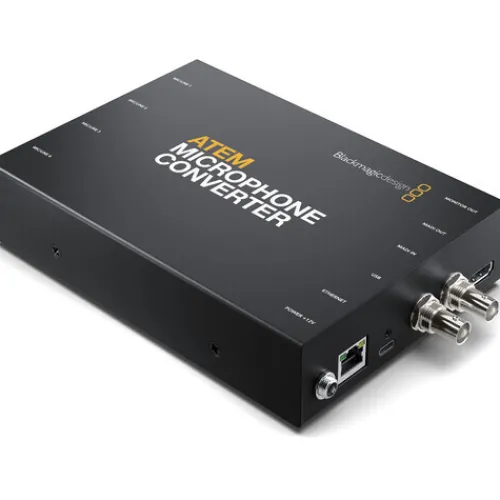 A common problem with mic converters is the higher noise floor where electrical noise is generated in the preamplifiers. The ATEM Microphone Converter eliminates this problem by using a very different design. The input is converted directly using its ultrahigh-dynamic-range conversion, so you pass RAW audio to the switcher, and then let the switcher apply as much gain as required for the correct audio level.