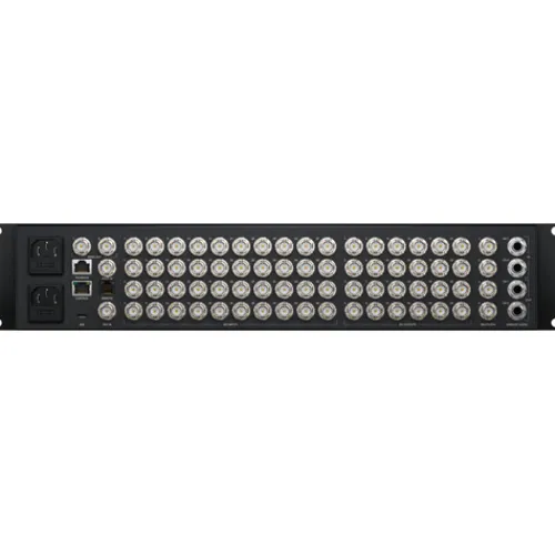The switcher features a compact rack mount design with a built-in control panel and a large LCD so you can see program output and change switcher settings via on-screen menus. The compact design is perfect for portable live production, with the rear of the switcher including connections for 12G-SDI inputs, aux outputs, balanced audio, and Ethernet for control. The 4 M/E models include RS-422 for serial control and MADI digital audio connections. Even with all this power, the switcher is extremely quiet with its innovative high-efficiency thermal system.