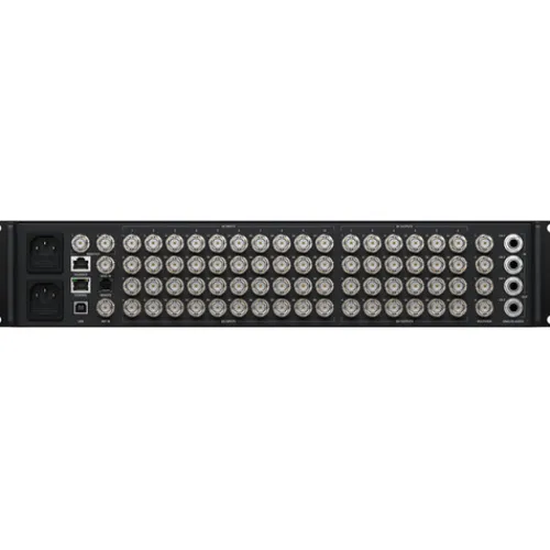 The relatively large LCD view screen on the front of the unit displays the input video with a label of the input number. You can control the Constellation 8K locally via the front panel buttons, or you can use the built-in Ethernet connector to control the system from a computer using the included control panel software. The built-in Fairlight audio mixer supports 80 channels of de-embedded audio from SDI, plus 64 channels in via MADI. Talkback functionality is available via the 5-pin XLR on the front of the unit or the RJ12 connector on the back.