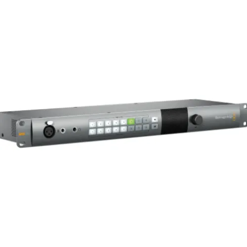 The Blackmagic Design ATEM Talkback Converter 4K is equipped with 12G-SDI, allowing it to accept high-resolution video from up to eight studio cameras or ATEM Camera Converters, facilitating seamless interaction between the control room and camera operators. These 12G-SDI connections support video resolutions up to 4096 x 2160 at 60 fps and route individual signals to a switcher via SDI outputs, to a program monitor through its own SDI output, and back to the camera operator, all while carrying talkback audio over a single cable. Talkback audio can be captured through a microphone connected to the XLR jack on the front or a headset mic plugged into the designated jack, also located on the front panel.