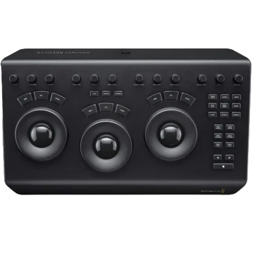 The DaVinci Resolve Micro Panel from Blackmagic Design is a portable control surface designed to enhance your workflow with DaVinci Resolve Studio software, offering more control than a keyboard and mouse alone. Ideal for editors and colourists on the go, it features three high-resolution, weighted trackballs and 12 control knobs for quick access to essential primary colour-correction tools in the included Resolve software. Additionally, 18 dedicated keys on the right side provide easy access to the most commonly used grading features and playback controls, streamlining your editing process.