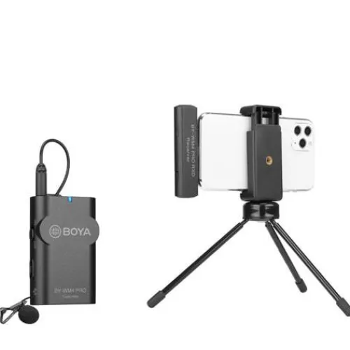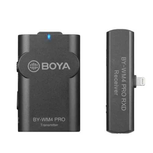 The kit includes a Boya TX4 Pro Body Pack Transmitter and a Boya BY-WM4 Pro RXD Miniature Receiver with a Lightning Connection, as well as an omnidirectional lavalier microphone.