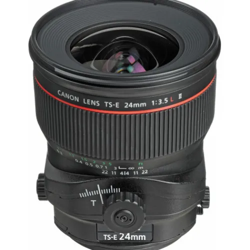 The Canon L-series tilt-shift lens, the TS-E 24mm f/3.5L II, is a great choice for landscape, interior, and architectural photography. It has improved perspective and focus adjustment, with up to 8.5 degrees of tilt and 12 mm of shift. A tilt-locking mechanism makes shooting more stable, and the tilt-shift mechanism can be turned +/- 90° for motion in any direction.
