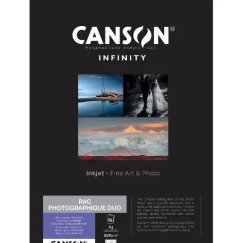 Canson Rag Photographique Duo is 100% cotton rag double-side coated paper that offers an exceptional 89.67% pure white tone by using natural minerals for an extra smooth, matte surface. It offers one of the highest achievable Dmax on the market.