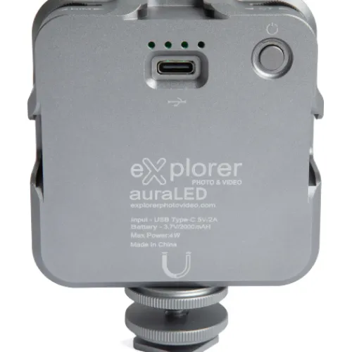 The Explorer AX-LED500 AuraLED 500 features a beautifully designed single-piece unibody case made from high-grade aluminium that is lightweight, and durable, and features a built-in magnet on the back of the LED that allows the LED to attach to any magnetic surface. The LED can be attached using a 1/4″-20 mounting screw for horizontal and vertical mounting and features three hot shoe mounts for attaching additional accessories.