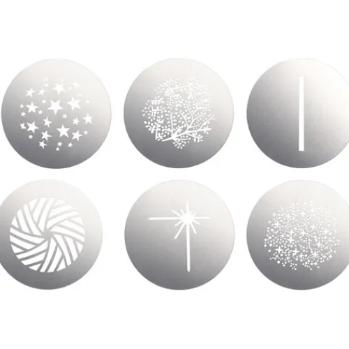 The Godox Gobo Set VSA-GS3 is a versatile accessory designed for use with the multi-faceted Projection Attachment, providing creative options for a variety of applications including theater, video production, filmmaking, actor headshots, and fashion photography. This set includes six gobos featuring designs such as a wheel, star, and horizontal line, allowing users to add personalized touches to their lighting setups, enhancing the visual impact and storytelling potential of their projects.