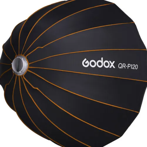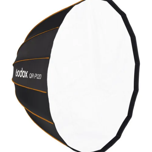 Ideal for portrait and fashion photography, the P120 Parabolic Softbox from Godox is a 16-sided light-shaper measuring 120 cm. It provides focused, soft output with a crisp edge, adding dimension and detail to your subject while producing natural-looking catchlights in their eyes. The unique depth of the modifier offers significant falloff at the field edge, enhancing directional control, reducing spill light, and facilitating easy feathering. The softbox includes removable outer and inner diffusers, which can be used individually or together to achieve different levels of contrast. Additionally, a convenient carry bag is included for storage and transport, making it perfect for on-the-go photographers.