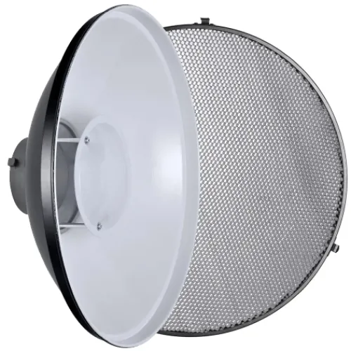 Elevate your photography with the 42cm beauty dish, featuring a soft white inner and a silver deflector for optimal light diffusion. The deflector dome effectively reflects light into the main dish, resulting in soft, diffused illumination that enhances your subjects’ appearance. Offering a versatile alternative to traditional softboxes, this beauty dish provides the option to attach a removable honeycomb grid for directional lighting and reduced harsh shadows. The honeycomb grid, easily attached using three metal clips, helps to control the spread of light and achieve soft diffusion, while eliminating unwanted glare. When used in combination, the beauty dish and honeycomb grid produce a soft transitional edge and impressive stereoscopic effects, ensuring your photos stand out with professional-quality lighting.