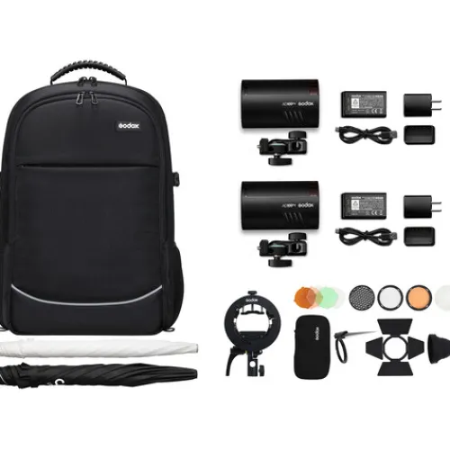 Designed for the traveling photographer, the AD100pro Pocket Flash 2-Light Kit from Godox offers studio-quality lighting in a highly portable package. This kit includes two AD100pro Pocket Flashes, providing powerful illumination in a compact and lightweight form factor. Additionally, it comes with an AK-R1 Accessory Kit, an S2 Speedlite Bracket for Bowens, a 34″ silver umbrella, a 33.5″ transparent umbrella, and a CB20 Backpack for convenient storage and transport, making it ideal for on-location shoots.