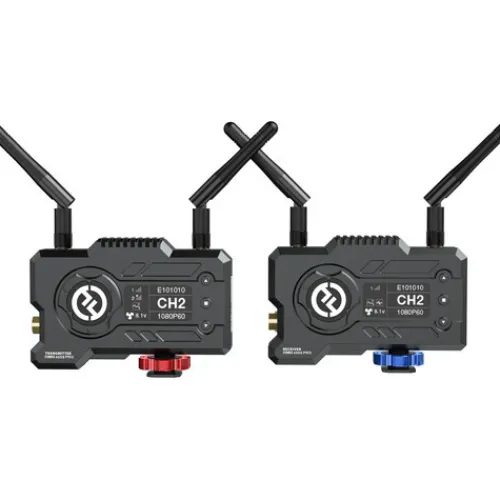 The transmitter has HDMI and SDI inputs, while the receiver has SDI and HDMI outputs. With line-of-sight transmission up to 120m to the receiver and up to 90m to the Hollyview Wi-Fi app, it has an extraordinarily low 0.08-second latency. The system features two external antennas on the transmitter and two on the receiver for a strong line-of-sight signal, with one spare antenna included.