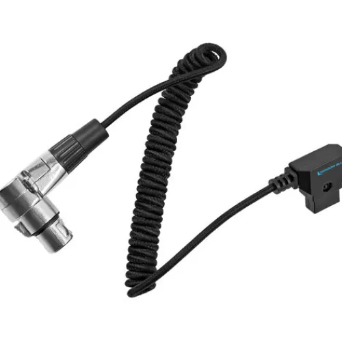 This Coiled D-Tap Male to 4-Pin XLR Female Right-Angle Power Cable allows you to connect a D-Tap power source, such as professional Gold mount or V-mount batteries, to any device that accepts 4-pin XLR female power inputs. It features a D-Tap male connector on one end and a 4-pin XLR female connector on the other. The coiled cable can extend from 20 to 50 inches in length.