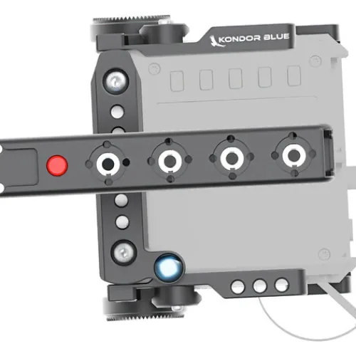 Both in grey, the RED KOMODO Cage with Top Handle from Kondor Blue features a minimalist, form-fitting design and offers left and right rosettes, top and side NATO rails, standard 1/4″-20 and anti-twist 3/8″-16 threads, and 1/4″-20 and 3/8″-16 tripod mount threads. On the front, the cage features two threads for an optional lens support. The powered remote trigger top handle attaches to the top NATO rail by quick release and provides two shoe mounts, a sideways 15mm rod port, and anti-twist threads. A magnetic tool set including an Allen key stores in the base of the cage.