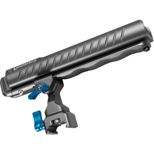 The KONDOR BLUE Pro-Blade SSD Handle also features a cold shoe with a spring-loaded safety stop and 2x 1/4 20 ARRI style mounts. The mounting NATO clamp can also be oriented in parallel or perpendicular modes and is held in place with two captive M4 bolts and anti-twist pins. The NATO clamp stem can also be removed altogether to work with KONDOR BLUE’s NATO Clamp to ARRI Rosette and Quick-Release Rosette Module.