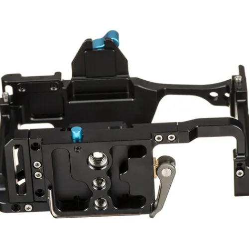 A cold shoe at the top of the cage can accommodate a wireless receiver or shotgun microphone. Two NATO rails can attach other accessories like the included top handle for even more mounting options and a start-stop record button. A built-in Arca-Swiss plate system secures the camera in the cage and offers a quick release configuration.