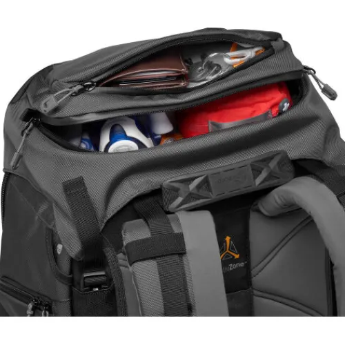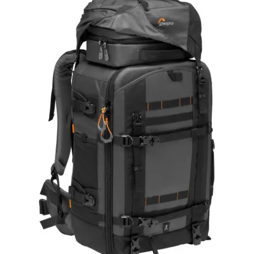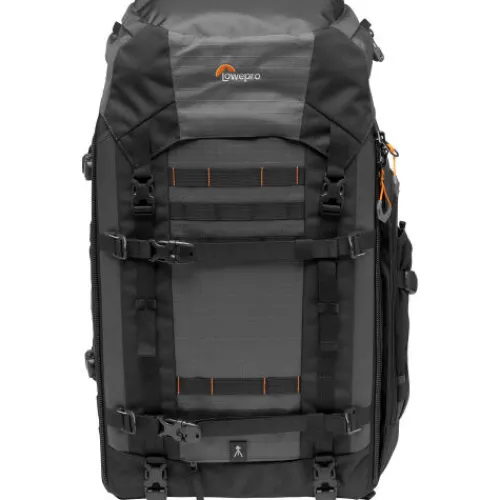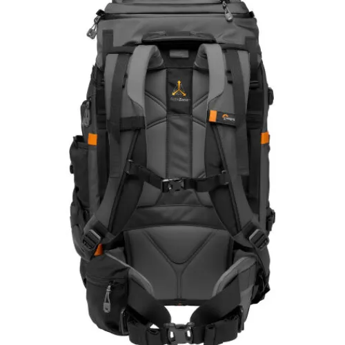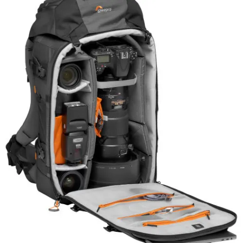 The Lowepro Pro Trekker BP 550 AW II is a spacious 40L backpack designed to protect your gear during travel. It fits a professional mirrorless camera with a 70-200mm lens, a drone kit, four lenses, and two flash units, or a DSLR with a grip and attached 400mm lens, two additional lenses, and two flash units. The fully customisable MaxFit divider system includes pocket dividers, a split-level divider for stacked flash units, and a removable gear box. A CradleFit sleeve in the front pocket securely holds a 15″ laptop and a 10″ tablet, while the detachable lid converts into a personal carry-on bag.