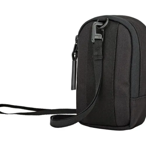 This Lowepro camera pouch can be carried either by its removable shoulder strap, or by an integrated, rear-facing belt loop that doubles as a convenient hand strap.