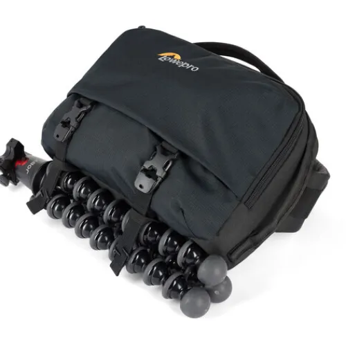 - Exterior straps for attaching a tabletop tripod or a rolled jacket