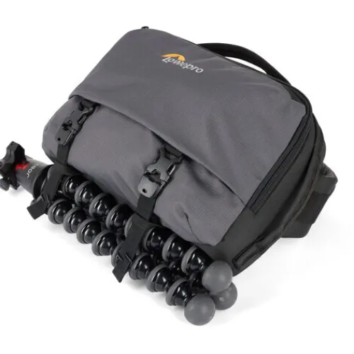 - Exterior straps for attaching a tabletop tripod or a rolled jacket
