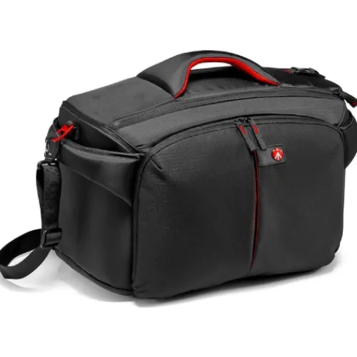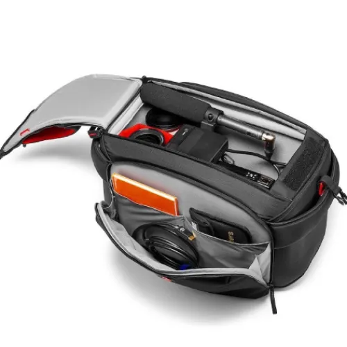 Keep your mirrorless DSLR, 24-70mm f/2.8 zoom lens, two extra lenses and related accessories safe and secure with the black Pro Light Bumblebee M-10 Camera Bag from Manfrotto. This bag also features a padded compartment with a touch-fastening tab, perfect for holding your laptop or tablet up to 33.02 cm. It opens with a large, noiseless, touch-fastening flap, and has padded, movable dividers for arranging your gear. Plus, there are plenty of accessory pockets for quick and easy storage. Under the flap are elastic side straps, ideal for securing a mini tripod or other items.
