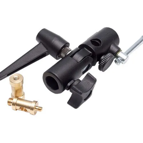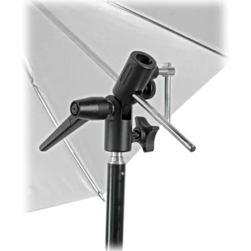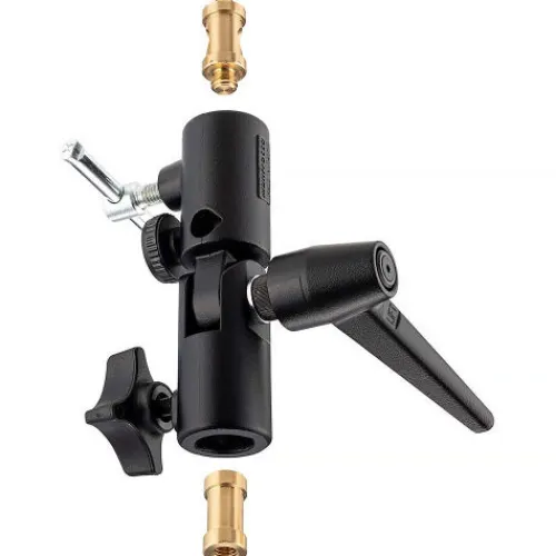 The Manfrotto Lite-Tite Swivel Umbrella Adapter is a durable and adaptable aluminium bracket that fits most light stands, featuring two removable, reversible studs with 1/4″-20 and 3/8″-16 male threads on one, and matching female threads on the other, to suit both threaded and unthreaded 5/8″ top studs. Ideal for mounting lights, shoe mounts and more, it also includes an umbrella receptacle and offers smooth tilting and secure locking with a large ratcheting handle.