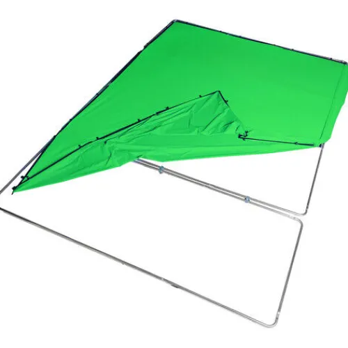 The kit consists of a fabric background held up by a three-part rigid aluminium frame with six clips and two tension rods. The frame has an elastic cord that runs through it, so no parts can be lost, and the rods hold the fabric tight with minimal wrinkles for fast, easy, and accurate keying in post. The frame can be configured to your needs: Curved to be free-standing or straight and leaned against a wall or other support for access to the entire workable surface area. The whole kit folds down to just 40.5 x 11.8″ and fits into the included carrying bag.