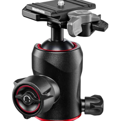 Manfrotto’s 496 Center Ball Head with 200PL-PRO Fast Release Plate has a 200PL-PRO quick release plate and an incorporated RC2 quick release cam lock. It may be mounted to tripods or other support systems using a 3/8″-16 mount and has a 26.5 lb load capacity. The ball-and-socket joint can be easily rotated, tilted, completely extended, or brought back to its upright position by loosening the primary locking knob on the head. The locking knob’s recessed dial can be turned to adjust the tension on the motions of the ball-and-socket joint. A secondary locking knob on the ball head’s opposite side regulates the head’s 360-degree rotation.