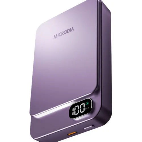 The Microdia SnapPower Aluminaire 35W Magnetic Power Bank in Purple is a compact and lightweight charging solution. It boasts a substantial 10,000mAh capacity, providing ample power for multiple device charges. Equipped with both wireless and USB-C charging capabilities, it offers a 15W wireless output and a 20W USB-C Power Delivery output, ensuring efficient charging for a variety of devices. The integrated LCD display allows for easy monitoring of the remaining power levels. Its magnetic design ensures a secure attachment to compatible devices, enhancing convenience during use. Certified to meet international safety standards, including Qi, CE, FCC, USB-IF, and RoHS, this power bank delivers reliable performance for users on the go.