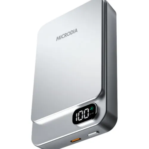 The Microdia SnapPower Aluminaire 35W Magnetic Power Bank in Silver is a compact and lightweight charging solution. It boasts a substantial 10,000mAh capacity, providing ample power for multiple device charges. Equipped with both wireless and USB-C charging capabilities, it offers a 15W wireless output and a 20W USB-C Power Delivery output, ensuring efficient charging for a variety of devices. The integrated LCD display allows for easy monitoring of the remaining power levels. Its magnetic design ensures a secure attachment to compatible devices, enhancing convenience during use. Certified to meet international safety standards, including Qi, CE, FCC, USB-IF, and RoHS, this power bank delivers reliable performance for users on the go.
