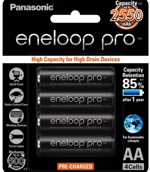 Delivering maximum performance for high drain devices such as digital cameras, flashes, toys and game controllers, the Eneloop Pro 4x AA NiMH Rechargeable Batteries (BK-3HCCE4BT) can be charged by any regular NiMH charger.