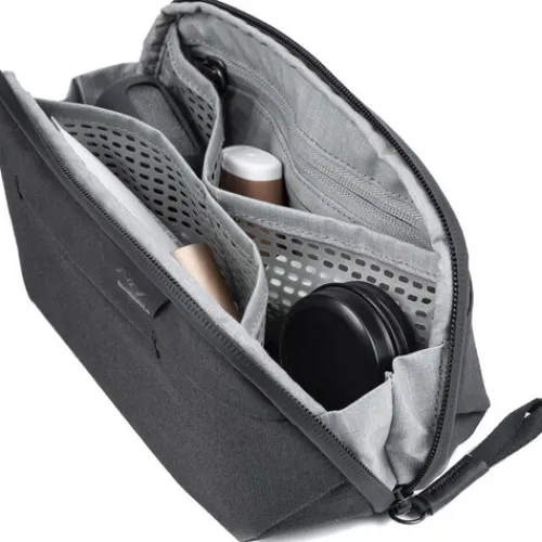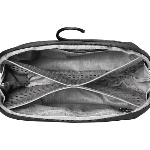 The Peak Design Wash Pouch in black is a handy and practical toiletry bag. It can sit upright on the counter or be hung up with its stow able hook, making it easy to access your toiletries. Despite its small size, the pouch can fit a variety of differently sized and shaped toiletries. It has a network of internal TPU-coated nylon mesh pockets, a magnetically-sealed toothbrush pocket, an external razor pocket, and an internal zippered pouch to keep your items organised and clean. All pockets can be easily turned inside out for quick cleaning. This pouch is great for ultralight travelling or short weekend getaways.