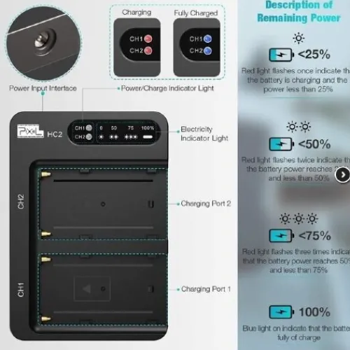 The Pixel NP-F Dual Battery Charger is a dual battery charger allowing you to recharge Pixel NP-F970 Battery as well as other Sony NP style batteries. It features LED indicators which display the charging status of each battery. A red light indicates that the battery is charging, and a blue light shows when the battery is fully charged.