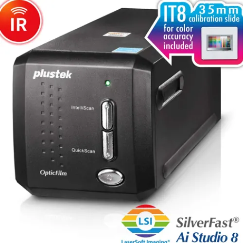 The Plustek OpticFilm 8200i AI is a powerful scanner with 7200 dpi resolution that delivers professional quality results from any photographic original. It is ideally suited to professional photographers, amateur photographers, graphic designers, image enthusiasts, and those who demand high image quality on photo enlargements. Its sharp optical system produces excellent detail in shadow areas and remarkable tonal range. A built-in infrared channel helps users remove dust and scratches on the original negatives and slides without additional post-processing. With the included IT 8 calibration slide, this powerful scanner consistently delivers accurate colours and detail.