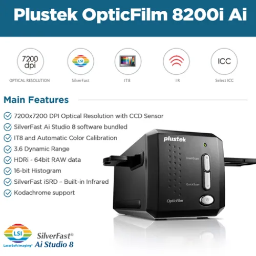 The Plustek OpticFilm 8200i AI and new SilverFast Ai Studio 8 software make a perfect combination. Bundled with the scanner, it includes SilverFast Multi-Exposure® which increases dynamic range, reduces noise and increases picture details; SilverFast iSRD® for dust and scratch removal; SilverFast Auto IT8 Calibration® that colour-calibrates the scanner device in just 2 minutes.; and a new WorkflowPilot® that guides users through all scanning and processing steps. A new graphical user interface reduces the learning curve, and the preview mode allows users to immediately see the results of any adjustments made, even the results of complex functions. SilverFast 8 supports multi-Tasking and the latest 64-bit hardware and is extremely fast and efficient.