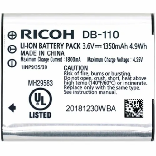 The Ricoh DB-110 Battery is the perfect spare or replacement for the one provided with the Ricoh GR III Camera. It offers long life and consistent power, and can be charged or discharged at any time without developing memory effects. This battery is also compatible with the BJ-11 battery charger.
