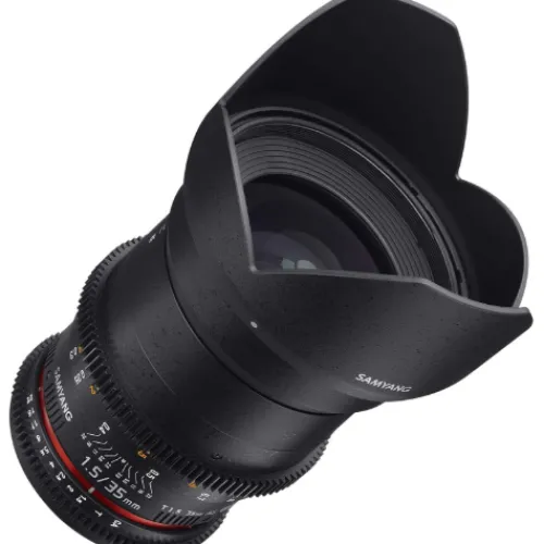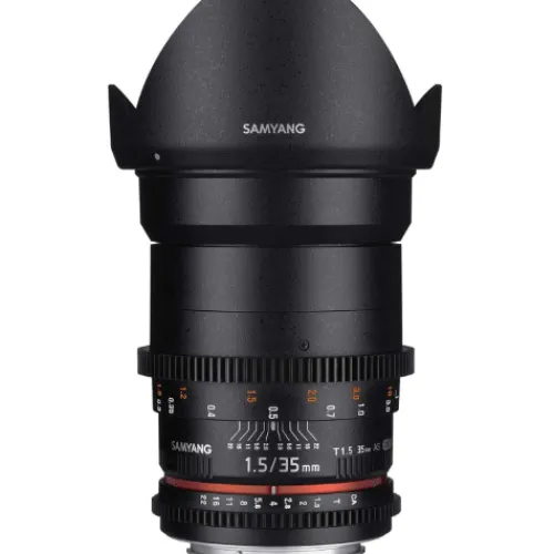 The lens can be used both in photography and cinematography, perfect for amateurs and professionals. The frame of Samyang 35mm T1.5 is compact and solid as it is made of high-strength aluminium alloy so trustworthy images can be captured even under inferior environments. Also, the detachable petal-shaped hood shelters the lens from unnecessary light. Filter size is 77mm.