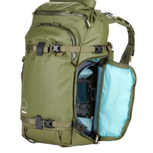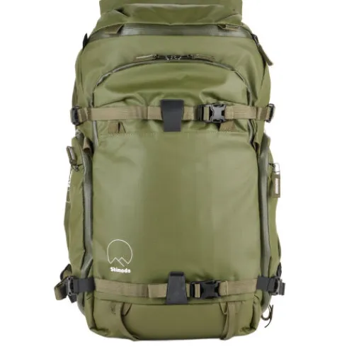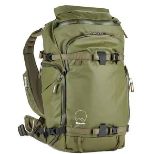 This army green Action X25 V2 Starter Kit from Shimoda Designs includes an Action X25 backpack, a small mirrorless core unit, a helmet holder, and a rain cover. The pack provides a compact, durable solution for photographers, offering fast access to gear. The internal core unit is a divider insert that fits most non-gripped, 4.7″ mirrorless cameras, with two padded sleeves to protect laptops or tablets up to 14″. The roll-top access allows you to expand or compress the volume as needed. Multiple attachment straps, including TPU compression straps, provide increased durability for securing bulky items like skis. The removable helmet holder ensures you can easily attach a bike or ski helmet to the exterior of the pack.