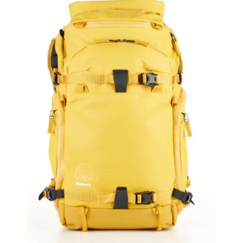 This yellow Action X25 V2 Starter Kit from Shimoda Designs includes an Action X25 backpack, a small mirrorless core unit, a helmet holder, and a rain cover. The pack offers photographers a compact and durable carry solution that provides quick access to gear. The internal core unit is a divider insert that fits most non-gripped, 4.7″ mirrorless cameras, with two padded sleeves to protect laptops or tablets up to 14″. The roll-top access allows you to adjust the volume as needed. It features multiple attachment straps, including TPU compression straps, for added durability when securing bulky items such as skis. The removable helmet holder allows you to attach a bike or ski helmet to the exterior of the pack.