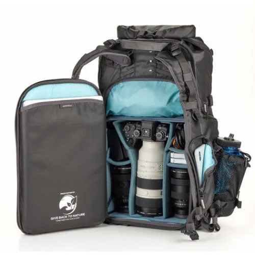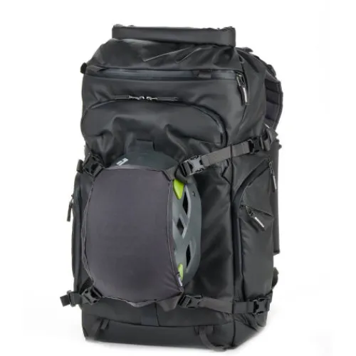 The black Action X30 V2 Backpack from Shimoda Designs offers a 30L capacity, providing photographers with a compact and durable carry solution that allows quick access to gear. Two padded sleeves protect laptops or tablets up to 16″. The roll-top access enables you to expand or compress the volume to meet your needs. The pack features multiple attachment straps, including TPU compression straps for enhanced durability when securing bulky items like skis. Additionally, the removable helmet holder ensures a bike or ski helmet can be easily attached to the exterior of your pack.