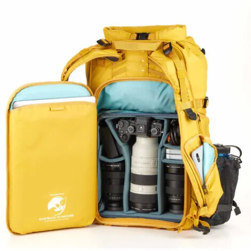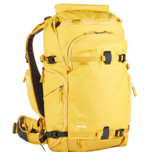 The yellow Action X30 V2 Backpack from Shimoda Designs has a 30L capacity, providing photographers with a compact, durable carry solution that offers quick access to gear. Two padded sleeves protect laptops or tablets up to 16″. The roll-top access allows you to expand or compress the volume to suit your needs. Multiple attachment straps, including TPU compression straps, enhance durability when securing bulky items such as skis. The removable helmet holder allows you to easily secure a bike or ski helmet to the exterior of your pack.
