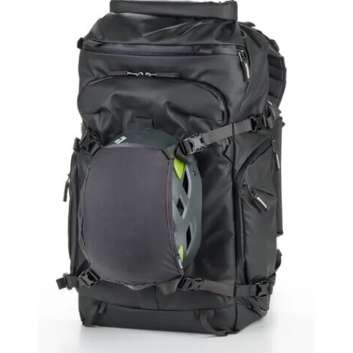This black Action X30 V2 Starter Kit from Shimoda Designs includes an Action X30 backpack, a medium mirrorless core unit, a helmet holder, and a rain cover. Designed for photographers, the pack offers a compact and durable carry solution with fast access to gear. The internal core unit is a divider insert that accommodates most non-gripped, 4.7″ mirrorless cameras, while two padded sleeves protect laptops or tablets up to 14″. The roll-top access allows you to expand or compress the volume to suit your needs. Multiple attachment straps, including TPU compression straps, provide increased durability for securing bulky items like skis. The removable helmet holder secures a bike or ski helmet to the exterior of your pack.