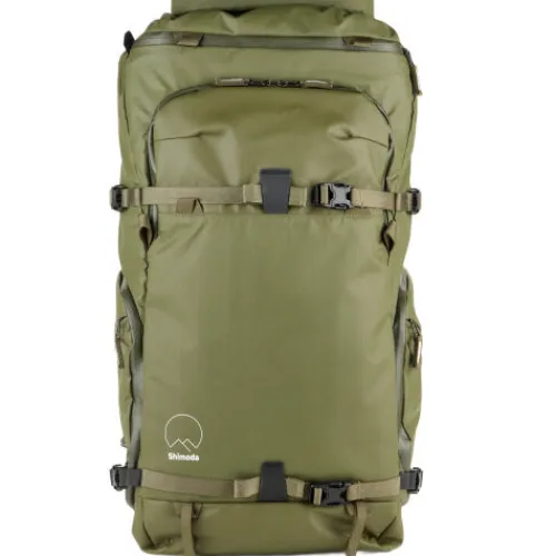 This army green Action X50 V2 Starter Kit from Shimoda Designs includes an Action X50 backpack, a medium DSLR core unit, a helmet holder, and a rain cover. Designed for photographers, the pack offers a compact and durable carry solution with quick access to gear. The internal core unit is a divider insert that accommodates most gripped, 6.7″ DSLR cameras, while two padded sleeves protect laptops or tablets up to 16″. The roll-top access allows you to expand or compress the volume based on your needs. Multiple attachment straps, including TPU compression straps, provide enhanced durability when securing bulky items such as skis. The removable helmet holder ensures you can attach a bike or ski helmet to the exterior of your pack.