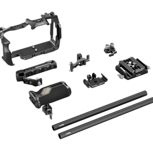 The SmallRig Advanced Cage Kit for Blackmagic Design Cinema 6K (Full-Frame) 4575 is crafted to offer a comfortable low-angle shooting experience, protect the camera, and provide versatile accessory expansion. Included in the kit are a cage, top handle, HDMI & USB-C cable clamp, SSD mount bracket, lens mount adapter support, dual 15mm carbon fibre rods, and a baseplate. The three-point locking system secures the camera using two 1/4″-20 screws at the base and one on top, with integrated silicone pads to prevent scratching. Full access to all camera interfaces, card slots, the flip screen, and the battery compartment is maintained. The lens adapter support is compatible with Sigma MC-31, Sigma MC-21, and similar adapters, protecting the camera’s mount. The kit also features HDMI & USB-C cable clamps to safeguard the camera’s ports and prevent signal loss. The ergonomic ARRI-type top handle ensures a comfortable low-angle shooting experience, while the universal rotating NATO side handle enables flexible camera movements. The SSD mount bracket is compatible with Samsung T5/T7 SSDs and includes a cold shoe mount for easy assembly and disassembly. Dual 15mm rods and baseplate allow attachment of accessories like a matte box (ID 3556), follow focus (ID 3918), and battery plate (ID 2991), enhancing your filmmaking or professional video setup. With various mounting options such as 1/4″-20 threaded holes, 3/8″-16 threaded holes, ARRI locating holes, cold shoe mounts, NATO rail, and QD mounts, the kit supports accessories like magic arms, side handles, top handles, rod clamps, baseplates, LED lights, microphones, and more.