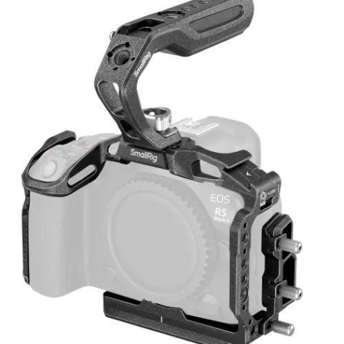 The SmallRig “Black Mamba” Cage Kit for Canon EOS R5 Mark II 4976 is designed to enhance handheld shooting stability, portability, and accessory expansion. The kit includes a robust cage, USB-C and HDMI cable clamps, and a HawkLock top handle. Featuring the sleek “Black Mamba” style, it combines aesthetics with functionality, addressing photographers’ shooting needs. The comfortable grip of the top handle improves camera portability and facilitates low-angle shooting, offering a seamless shooting experience.