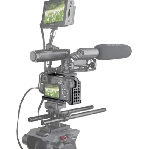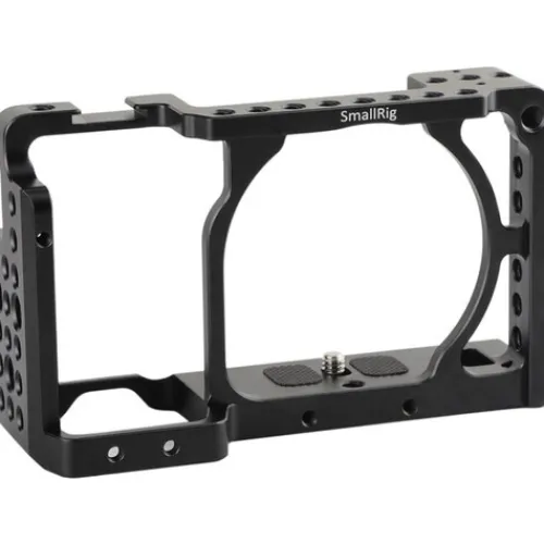 Keep your Sony a6500, a6300, a6000, or NEX-7 camera safe and add accessories with this formfitting Camera Cage from SmallRig. The cage offers plenty of mounting options for your camera, so you can attach a microphone, handle, monitor, or other accessories. It features multiple 1/4″-20 threads and a shoe mount on top.