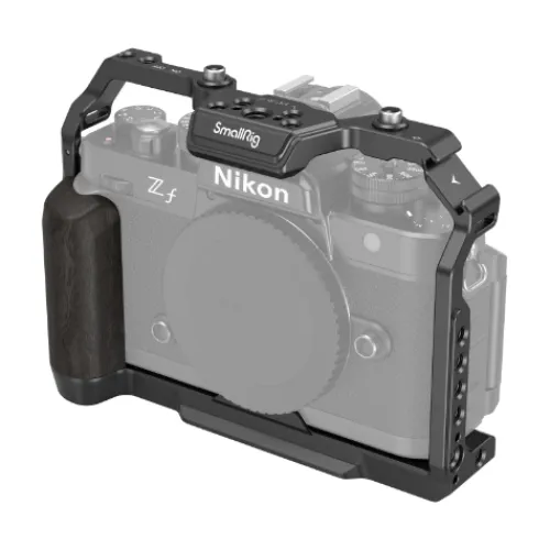 The SmallRig Camera Cage for Nikon Z f 4261 is designed to provide robust protection, accessory mounting options, and improved grip. Secured with a 1/4″-20 screw at the bottom and an M2.5 screw on the right, the cage prevents scratches with rubber pads and ensures full access to buttons, card slots, the flip screen, and battery door. The ergonomic ebony handle offers a comfortable grip and texture, while the top design maintains functionality with ease of dial control. The cage features 1/4″-20 threaded holes, 3/8″-16 threaded holes, ARRI 3/8″-16 locating holes, and cold shoe mounts for attaching accessories.