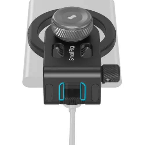 The SmallRig MagSafe / Cold Shoe Universal 2-in-1 SSD Holder 4779 is designed for seamlessly connecting USB-C external hard drives during smartphone photography. It is compatible with SSDs ranging from 8.0 to 16.0mm (0.3 to 0.6in) thick, particularly the Samsung T7, Samsung T7 Shield, and Samsung T9 models. The holder features a slide-in cold shoe mount, allowing for quick installation at the base for attachment to various devices. Alternatively, remove the cold shoe mount to enable MagSafe magnetic attachment to locations like laptops or iPhones with MagSafe, offering flexible mounting options for different setups. Both installation methods are simple and efficient, allowing for swift transitions between usage scenarios. The clamp is equipped with silicone padding to prevent scratches on the SSD, while a cable clamp at the base secures the USB-C cable with a thumbscrew, ensuring stable and reliable data transmission. Additionally, the holder comes with a metal ring sticker for versatile mounting options in various settings.
